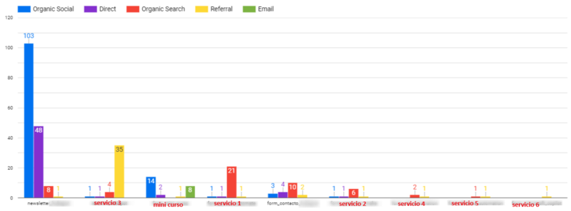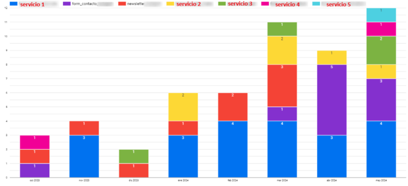 En este gráfico de barras apiladas se puede ver la evolución de la captación de leads y suscriptores a la newsletter a través del canal de búsqueda orgánica. Hasta octubre del 2023 la web no empezó a captar las primeras conversiones orgánicas, un resultado muy bueno y rápido dadas las características del proyecto.
